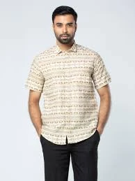 Beige endi cotton shirt with brown prints. Features chest pocket and french placket.